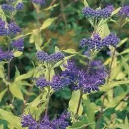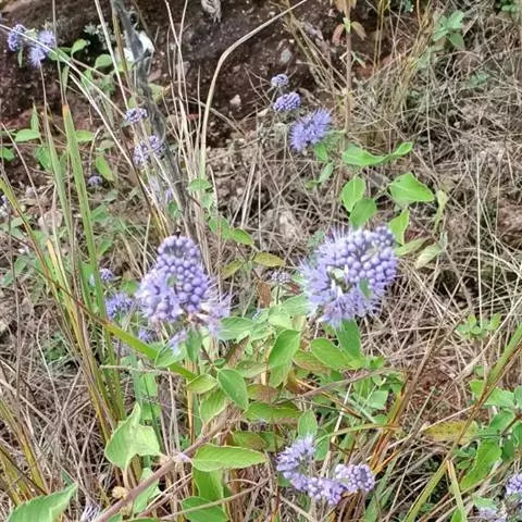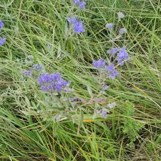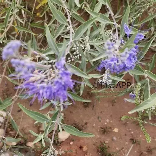 蒙古莸(学名:Caryopteris mongholica Bunge):为马鞭草科莸属落叶小灌木。常自基部即分枝,嫩枝紫褐色,圆柱形,有毛,老枝毛渐脱落。叶片厚纸质,线状披针形或线状长圆形,背面密生灰白色绒毛。聚伞花序腋生,无苞片和小苞片,花萼钟状,花冠蓝紫色。蒴果椭圆状球形,无毛,果瓣具翅。花果期8-10月。