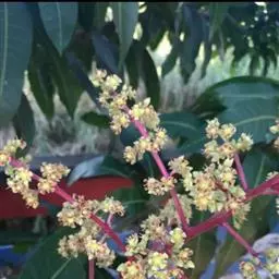 芒果树自然开花在每年12月至次年1-2月,有时会早至11月或迟到次年3月,盛花期在春节前后。一个花序从第一朵花开放至全花序开放完毕需15-25天,一株树的花期约50天。芒果花有两性花与雄花,两性花有发育正常的雄蕊和雌蕊,可进行正常的传粉受精和结实;雄花没有雌蕊,开花后不能结实。多数栽培品种两性花占15%以上。一朵花从花瓣展开至柱头干枯约1.5天。