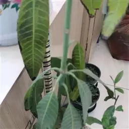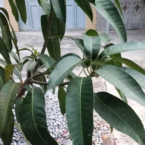 芒果 常绿大乔木,高10-20米;树皮灰褐色,小枝褐色,无毛。叶薄革质,常集生枝顶,叶形和大小变化较大,通常为长圆形或长圆状披针形,长12-30厘米,宽3.5-6.5厘米,先端渐尖、长渐尖或急尖,基部楔形或近圆形,边缘皱波状,无毛,叶面略具光泽,侧脉20-25对,斜升,两面突起,网脉不显,叶柄长2-6厘米,上面具槽,基部膨大。