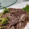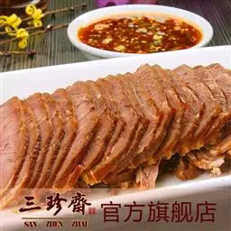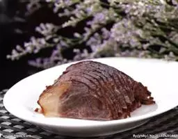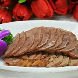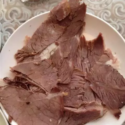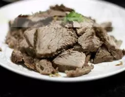 1.将牛后腿肉洗净,切成两块,放在冷水里浸泡1小时后捞起,放在汤锅中,加清汤、葱段、姜块、花椒、黄酒,上火烧沸,撇去浮沫,转小火上煮3小时,待牛肉九成烂时,捞出控去汤,晾凉。