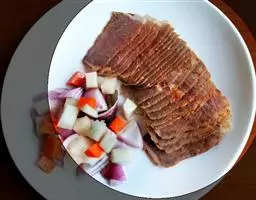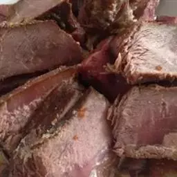 2.牛肉用盐、葱、姜、盐、料酒拌匀腌1小时,腌制好的牛肉块上屉蒸烂晾凉,切成长4厘米、宽1厘米的长方条。