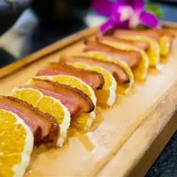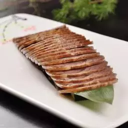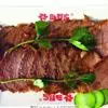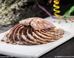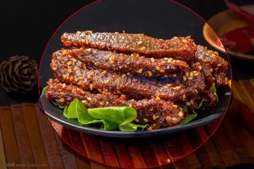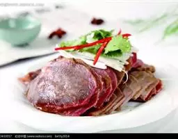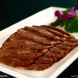 3.将香油注入锅中,上火烧至七成热,下入干辣椒炸焦,再放入葱段、姜段桂皮、花椒略炸一下,随即注入清汤,加入料酒、精盐、白糖、酱油,再倒入炸好的牛肉片,在微火上将汁靠浓。待汁快靠完时,倒入盆中晾凉,将牛肉挑出码在圆盘内,上面码上用燕窝做成的“吉”字即成。