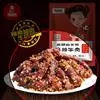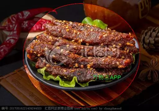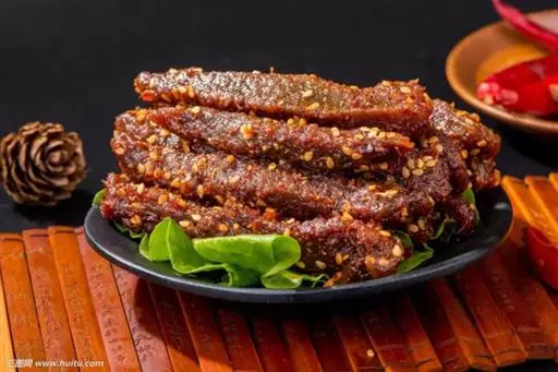 4.锅底留油25克,烧糊花椒捞出不要,再炸干辣椒成紫黑色,加葱、姜炒一下,注入汤150毫升,加酱油、糖及余下料酒,放入牛肉上火收汁,汁快尽时加入味精,汁干时加入辣椒油,撒上芝麻,翻匀即成,食时挑去辣椒装盘。