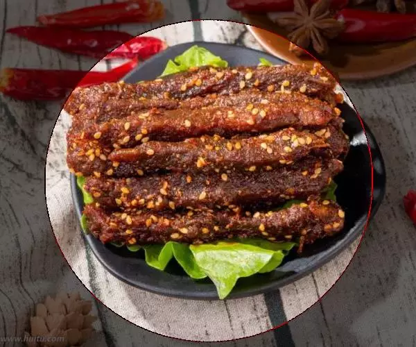 4、锅内放豆油75克,烧热,放入花椒,炸糊后捞出,弃之。油稍凉一些,放入干红辣椒炸成紫黑色时,加入葱、姜炒一下,放入牛肉汤,加酱油、味精、牛肉条,用中等火力将汁收浓,汁尽时浇上辣椒油,撒上焙好的芝麻。