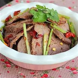 3、将煮熟的牛肉切成长方形薄片,码在盘中,浇上麻辣汁,撒上熟芝麻仁与葱末,吃时拌匀即成。