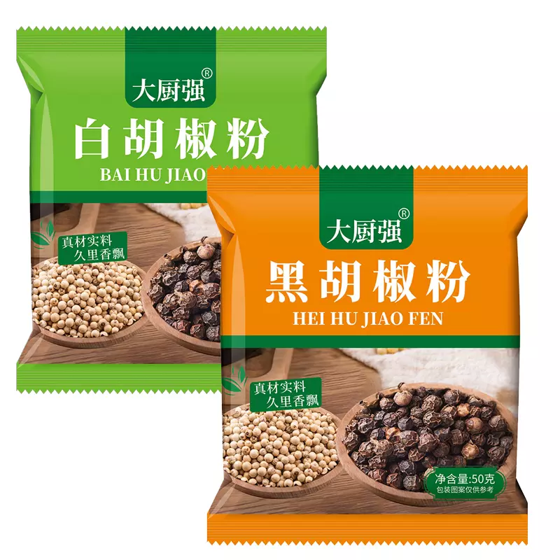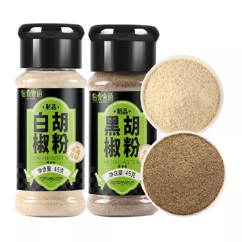 胡椒粉分白胡椒粉和黑胡椒粉两种,白胡椒粉为成熟的果实脱去果皮的种子加工而成,色灰白,种仁饱满,气味较浓,品质较好;黑胡椒粉是未成熟而晒干的实加工而成,果皮皱而黑,气味较淡。两者性情也不同。专家说,黑胡椒粉走里,味重,调味作用稍好;白胡椒粉药用价值更高,走表,辛散作用更好。