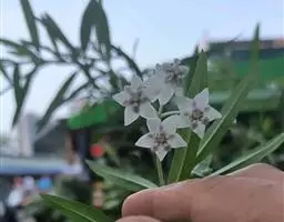 狗牙花 R. Br. ex Roem. & Schult.)是夹竹桃科山辣椒属灌木植物;枝灰绿色;叶椭圆形或椭圆状长圆形,叶面深绿色,背面淡绿色,叶面扁平;花聚伞花序腋生,通常双生,萼片长圆形,边缘有缘毛,花冠白色;果长圆形;花期六至十一月;果期秋季。狗牙花因其花冠裂片边缘有皱纹,状如狗牙,故名。狗牙花原产于印度及中国云南,在广西、广东、台湾及亚洲热带和亚热带等地区广泛栽培。狗牙花喜温暖湿润,不耐寒,宜半阴,对土壤要求不严,喜肥沃、排水良好的酸性土壤,常生长于山地灌木丛中。狗牙花的主要繁殖方式为扦插。狗牙花味酸、凉,有清热降压、解毒消肿的功效,可用于治疗咽喉肿痛,跌打损伤。狗牙花枝叶茂密,株型紧凑,花朵净白素丽,典雅朴质,盛花时十分美观,且花期长,具有一定观赏价值。狗牙花还有较高的经济价值,园林中应用极为普遍,可丛植于林缘、路