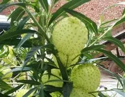 灌木 状草本。株高约2米。茎直立,灰绿色,具白毛。叶片线形或长披针形,似柳叶。花腋生,花白色。果黄色,圆锥形,果面有刺突,中空。果实很薄,肿胀呈球形,用手轻轻挤压,似有空气溢出,极像小气球,观果期长.