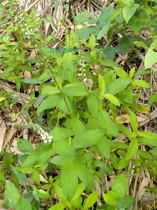 多年生草本,全株无毛。根状茎横走,紫红色。茎直立,高30-70cm,圆柱形,有黑色腺点,基部紫红色,通常不分枝,嫩梢和花序轴具褐色腺体。叶互生,近于无柄,叶片长圆状披针形至狭椭圆形,长4-11cm,宽1-2.5cm,先端渐尖或短渐尖,基部渐狭,两面均有黑色腺点,干后成粒状突起。总状花序顶生,细瘦,长10-20cm;苞片披针形,长2-3mm;花梗与苞片近等长或稍短;花萼长约1.5mm,分裂近达基部,裂片卵状椭圆形,先端钝,周边膜质,有腺状缘毛,背面有黑色腺点;花冠白色,长约3mm,基部合生部分长约1.5mm,裂片椭圆形或卵状椭圆形,先端圆钝,有黑色腺点;雄蕊比花冠短,花丝贴生于花冠裂片的下部,分离部分长约1mm;花药卵圆形,长约0.5mm;花粉粒具3孔沟,长球形[(22-24) ×(15-16)μm],表面近于平滑;子房卵圆形,花柱粗短,长约1mm。蒴果球形,直径约2-2.5mm。花期6-8月;果期8-11月。