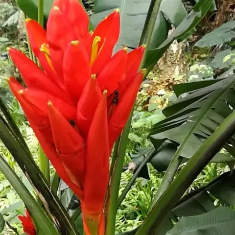金嘴蝎尾蕉:芭蕉科,蝎尾蕉属多年生草本植物。株高可达6米。叶片长圆形,叶面绿色,叶背亮紫色;顶生花…