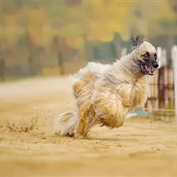 阿富汗猎犬全身披丝绢状的长毛,毛色鲜艳,呈多种颜色,背中线附近毛短,…
