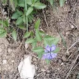 多年生草本,有时蔓生,仅基部木质化,高30-60厘米;茎方形,被向下弯曲的柔毛。叶片纸质,宽卵形至近圆形,长1.5-5厘米,宽1.5-4厘米,顶端钝,基部阔楔形至圆形,边缘具4-6对钝齿,两面均被柔毛及腺点,侧脉3-5对;叶柄长0.3-1厘米,被柔毛。单花腋生,有长1.5-3厘米的纤细花柄,近花柄中部生两枚锥形细小苞片;花萼杯状,长约6毫米,结果时略增大,两面均被柔毛和疏生腺点,5裂,裂片卵圆形至卵状披针形,有明显脉纹;花冠淡兰色,外面疏生细毛和腺点,喉部通常被柔毛,下唇中裂片较大,全缘,花冠管长6-9毫米;雄蕊4枚,与花柱均伸出花冠管外,子房密生绒毛。蒴果4瓣裂,果瓣倒卵形,无翅,表面被粗毛,不明显凹凸成网纹,长约4毫米,淡黄色。花果期5-9月。