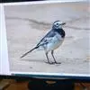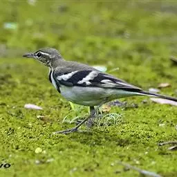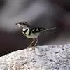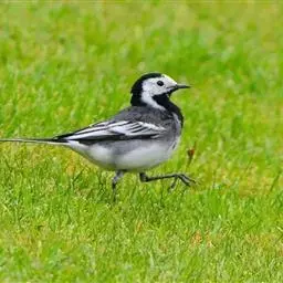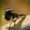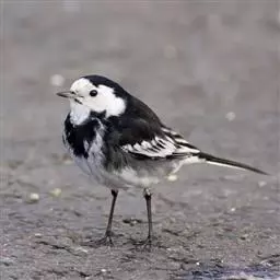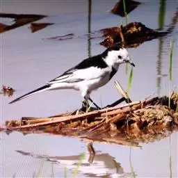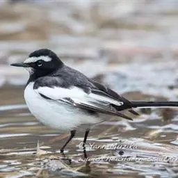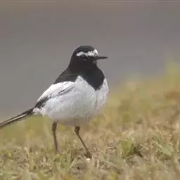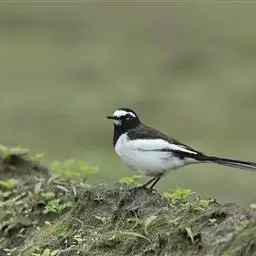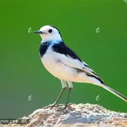 日本鹡鸰:体长约20厘米。上体多黑色,额、颏及眉纹白,下体白,两翼黑而具白色横斑及羽缘,…