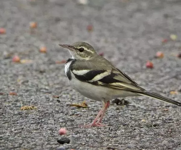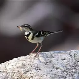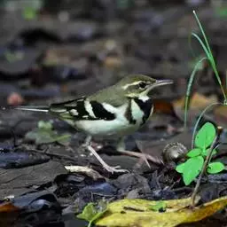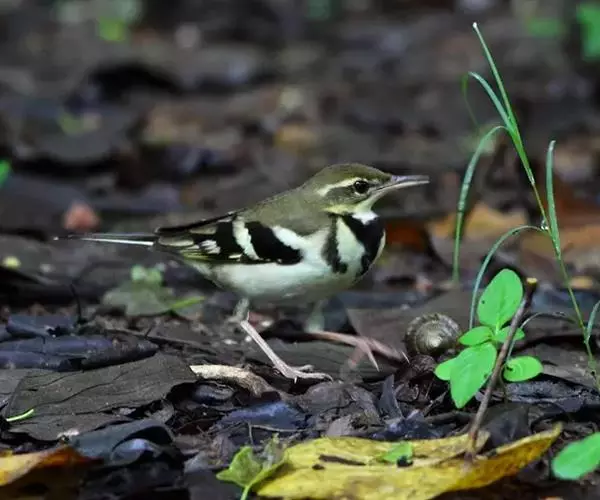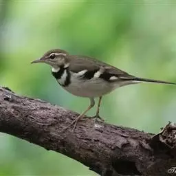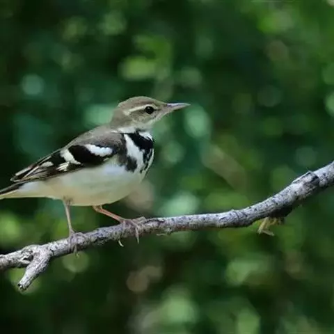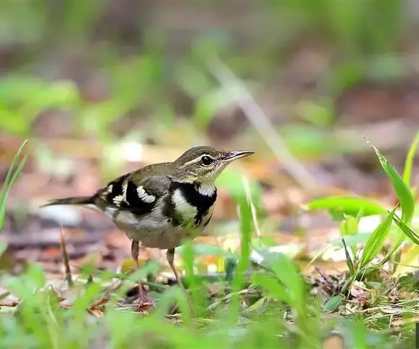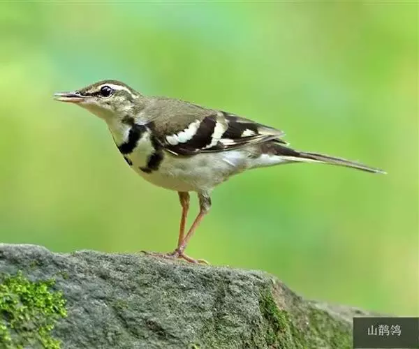 山鹡鸰(学名:Dendronanthus indicus):是中等体型的林鹡鸰,体长约17厘米,主要羽色为褐色及黑白色。头部和上体橄榄褐色,眉纹白色,从嘴基直达耳羽上方,下体白色,胸部具有两道黑色横斑纹,下面的横斑纹有时不连续。两翼黑褐色,具有2条白色翅斑。尾羽褐色,最外侧1对尾羽白色。下体白色,胸上具两道黑色的横斑纹,较下的一道横纹有时不完整。虹膜灰色;鸟喙角质褐色,下嘴较淡;脚偏粉色。