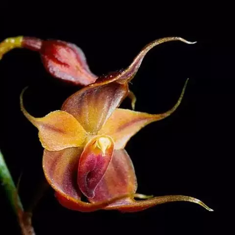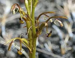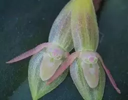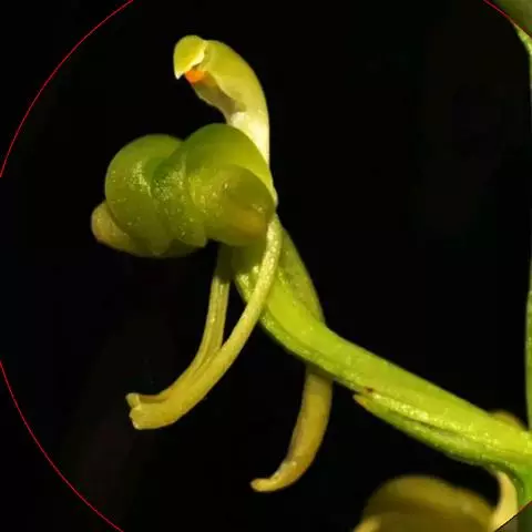 附生草本,较高大。假鳞茎稍密集,通常为圆柱形,较少近长圆形,基部常多少平卧,自下向上渐狭,上部直立,长(3-)7-18厘米,直径3-8(-12)毫米,顶端具2叶。叶线状倒披针形或线状匙形,纸质,长8-25厘米,宽1.2-3厘米,先端渐尖并有细尖,基部收狭成柄,有关节;叶柄长1-4厘米。花葶长14-30厘米,外弯;花序柄略压扁,两侧有很狭的翅,上部靠近花序下方有1-2枚不育苞片;总状花序长9-20厘米,具数十朵小花;花苞片狭披针形,薄膜质,长3-7毫米;花梗和子房长4-7毫米;花绿白色或淡绿黄色,较密集;中萼片近椭圆状长圆形,长2-3毫米,宽0.8-1毫米,先端钝,边缘外卷;侧萼片卵状椭圆形,略宽于中萼片;花瓣狭线形,长2-3毫米,宽约0.3毫米,先端浑圆;唇瓣近卵状长圆形,长2-3毫米,宽约1.7毫米,先端近急尖或具短尖头,边缘略呈波状,从中部向外弯,无胼胝体;蕊柱长1.5-2毫米,稍向前弯曲,顶端有翅,基部略扩大。蒴果倒卵状椭圆形,长4-6毫米,宽3-4毫米;果梗长3-6毫米。花期9-12月,果期次年1-4月。
