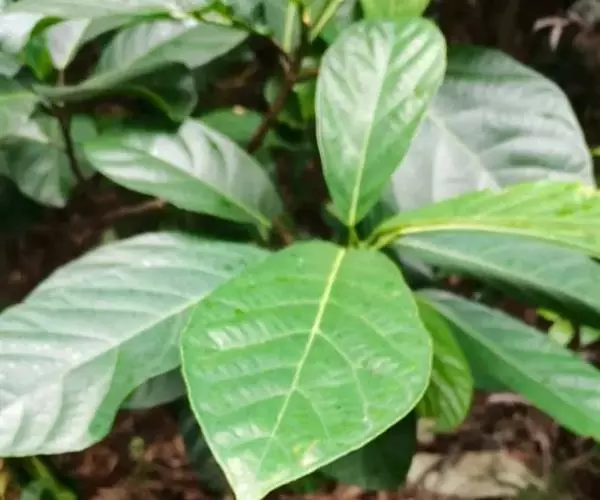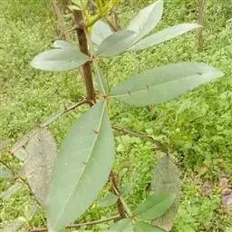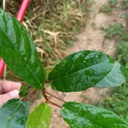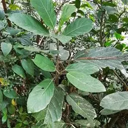 常绿小乔木,树皮黑褐色,枝粗糙,叶互生,纸质,倒卵形至长圆形,长10-20厘米,宽4-7厘米,先端具短尖,基部斜楔形或圆形,全缘或微波状,表面无毛,背面微被柔毛或黄色小突体;基生侧脉短,侧脉6-9对;叶柄长1.5-4厘米;托叶卵状披针形,长约1.7厘米。