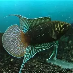 叉尾斗鱼,体形与圆尾斗鱼相似。腹鳍有1根分节鳍条特别延长,雄鱼鳍条延长尤甚,尾鳍叉形。…