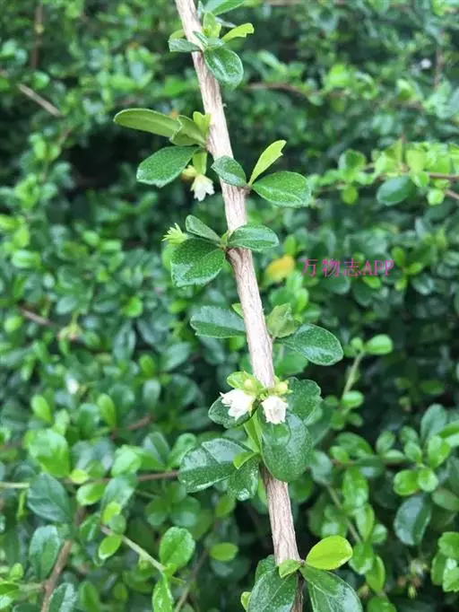 灌木,高1-3米,具褐色树皮,多分枝;分枝细弱,节间长1-2厘米,幼嫩时被稀疏短硬毛;腋芽圆球形,被淡褐色绒毛。叶在长枝上互生,在短枝上簇生,革质,倒卵形或匙形,长1.5-3.5厘米,宽1-2厘米,先端圆形或截形、具粗圆齿,基部渐狭为短柄,边缘上部有少数牙齿,上面有短硬毛或斑点,下面近无毛;脉在叶上面下陷,在下面稍隆起。