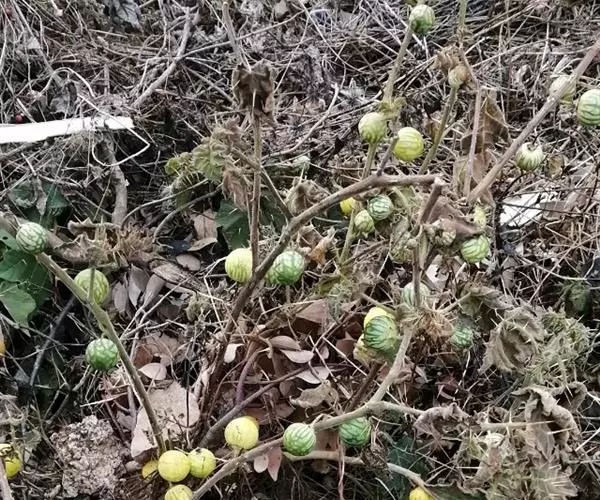 浆果球状,直径约2-2.5厘米,初时绿白色,具绿色花纹,成熟时淡黄色,宿萼上具纤毛及细直刺,后逐渐脱落;种子淡黄色,近倒卵形,扁平,直径约2.5毫米。花期春夏,果熟期冬季。 [2-3]