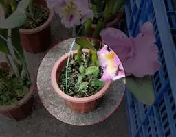 上盆(或翻盆)时间一般在春季3-4月或秋季10-11月。花盆以口小、盆深、底孔大的为佳。新从山上挖来的野生苗需理植于瓦盆(泥盆)中,这样兰花泥易干,通气性好.容易发根;2-3年后方可换人紫砂盆或瓷盆。兰花种植(在盆中)的方法与一般花卉不同,尤其是名种兰花,翻种移盆必须洗根。方法足将根浸入清水中,用旧牙刷或毛笔轻轻洗刷,切勿用力过大伤根;用剪刀将残叶、黄叶、断裂根、发黑腐烂根剪去,注意勿伤幼芽。然后将处理好的植株放在阴凉通风处晾干,待根部发白并显细小皱纹柔软时,再植入盆中。
