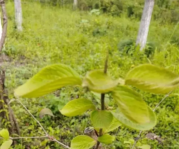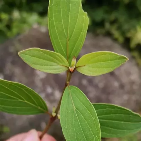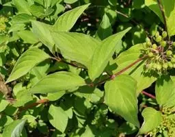 落叶乔木或灌木,高4-10米;树皮灰褐色;小枝细圆柱形,无毛或稀被贴生短柔毛冬芽顶生及腋生,卵形至披针形,被黄褐色短柔毛。叶对生,纸质,卵状披针形或卵状椭圆形,长5.5-10厘米,宽2.5-4.5厘米,先端渐尖,基部宽楔形或近于圆形,全缘,上面绿色,无毛,下面浅绿色,稀被白色贴生短柔毛,脉腋密生淡褐色丛毛,中脉在上面明显,下面凸起,近于无毛,侧脉6-7对,弓形内弯;叶柄细圆柱形,长0.6-1.2厘米,上面有浅沟,下面圆形,稍被贴生疏柔毛。