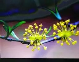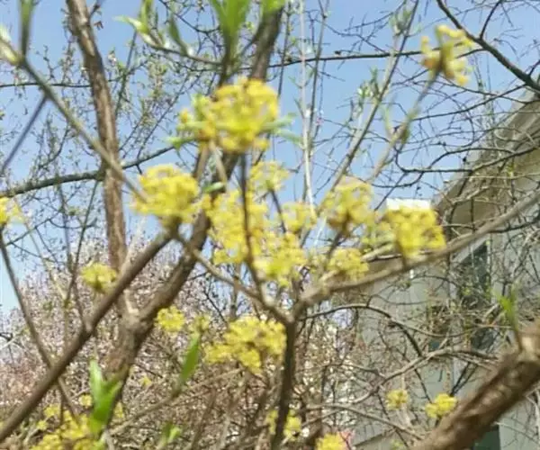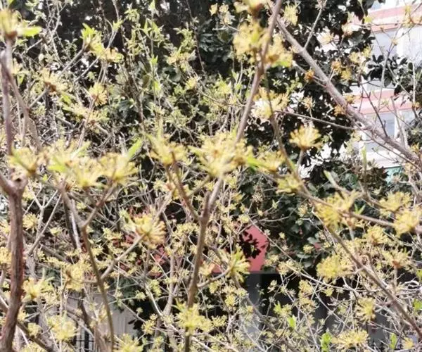 伞形花序生于枝侧,有总苞片4,卵形,厚纸质至革质,长约8毫米,带紫色,两侧略被短柔毛,开花后脱落;总花梗粗壮,长约2毫米,微被灰色短柔毛;花小,两性,先叶开放;花萼裂片4,阔三角形,与花盘等长或稍长,长约0.6毫米,无毛;花瓣4,舌状披针形,长3.3毫米,黄色,向外反卷;雄蕊4,与花瓣互生,长1.8毫米,花丝钻形,花药椭圆形,2室;花盘垫状,无毛;子房下位,花托倒卵形,长约1毫米,密被贴生疏柔毛,花柱圆柱形,长1.5毫米,柱头截形;花梗纤细,长0.5-1厘米,密被疏柔毛。