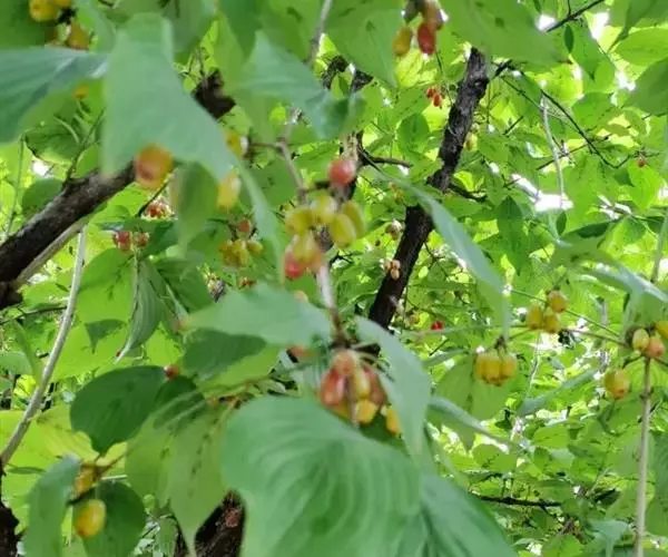 核果长椭圆形,长1.2-1.7厘米,直径5-7毫米,红色至紫红色;核骨质,狭椭圆形,长约12毫米,有几条不整齐的肋纹。花期3-4月;果期9-10月。