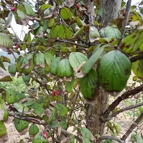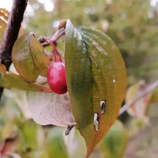 危害症状:木撩尺蠖(造桥虫)幼虫咬食叶片,仅留叶脉,造成枝条光秃,使树势生长减弱,当年结果少,第2年也不能结果。其虫卵产在山茱萸树枝分叉下部的树皮缝内。