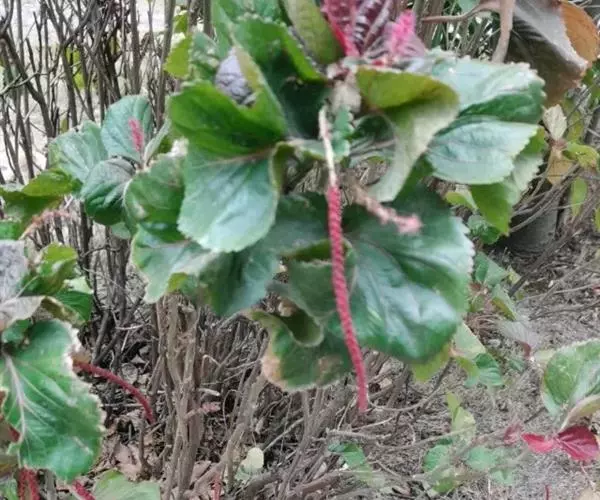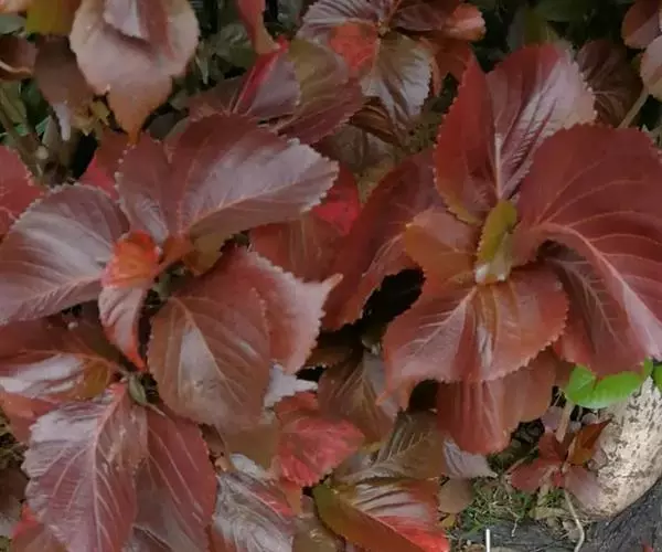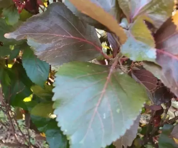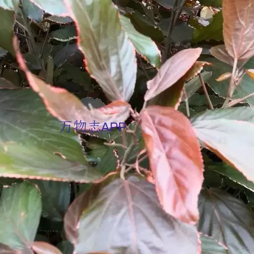 灌木,高1-4米;嫩枝被短毛。叶纸质,阔卵形,古铜绿色或浅红色,常有不规则的红色或紫色斑块,长10-18厘米,宽6-12厘米,顶端渐尖,基部圆钝,边缘具粗圆锯齿,下面沿叶脉具疏毛;基出脉3-5条;叶柄长2-3厘米,具疏毛;托叶狭三角形,长约8毫米,基部宽2-3毫米,具短毛。