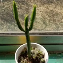 肉质灌木状小乔木,乳汁丰富。茎圆柱状,上部多分枝,高3-5(8)米,直径6-15厘米,具不明显5条隆起、且呈螺旋状旋转排列的脊,绿色;髓近五棱形,糠质。