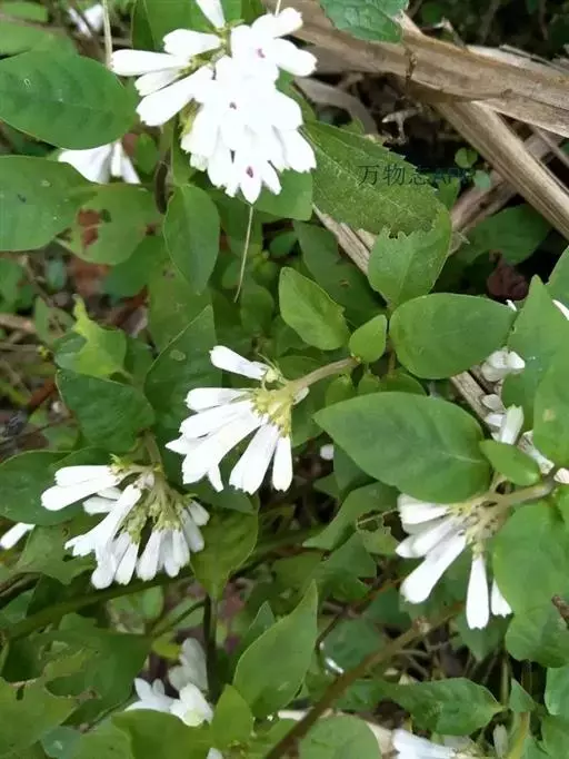 花序顶生,有花多朵,总梗长通常1-2厘米,多少被柔毛,分枝通常短,螺状;花二型,花柱异长;长柱花:花梗长1-2毫米,常被短柔毛;小苞片披针状线形或线形,长4-6毫米,渐尖,近无毛或被稀疏缘毛;萼近无毛或被短柔毛,萼管近陀螺状,长约1.3毫米,宽约1.4毫米,有5棱,裂片三角形或近披针形,长0.7-1.2毫米;花冠白色或粉红色,近漏斗形,外面无毛,管长1-1.3厘米,喉部扩大,里面被短柔毛,裂片5,三角状卵形,长2.5-3毫米,顶端内弯,喙状,里面被鳞片状毛,背面有翅,翅的顶部向上延伸成新月形;雄蕊5,着生在冠管中部之下,花丝无毛,长2-2.5毫米,花药线形,长2.5-3毫米;花柱长9-11毫米,被疏柔毛,柱头2裂,裂片近圆形或阔卵形,长约1毫米,不伸出;短柱花:花萼和花冠同长柱花;雄蕊生喉部下方,花丝长2-2.5毫米,花药长2.5毫米,不伸出;花柱长约3毫米,柱头裂片披针形,长约3毫米。