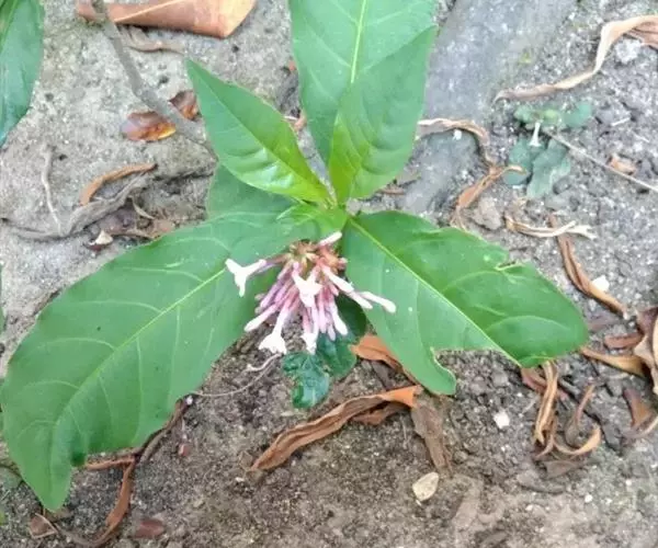 药材性状:本品全体长10cm~20cm,少有长30cm者。茎圆柱形,基部节上具少数须根,幼枝具棱,红色。叶对生,红色或淡红紫色,多皱缩,展开后呈狭卵形、卵形或长椭圆状卵形,长2.5cm~8cm,宽1.5cm~3.2cm,具长1cm~3cm的纤细叶柄。聚伞花序顶生,总梗长2cm~5cm,二歧分枝,分枝短;花冠筒状漏斗形,5裂。蒴果扁倒三角形,状似菱角,红紫色。气无,味淡。以枝条粗壮、叶多、色淡红紫色者为佳。