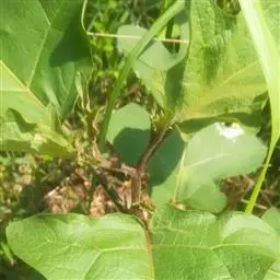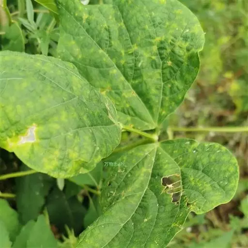 症状:病叶叶脉初期有红色条斑,后变成黑褐色多角形网状斑。叶柄和茎病初为锈褐色小斑,后期变成锈褐色凹陷龟裂细条形斑。染病豆荚有近圆形褐色至黑褐色斑,病斑周缘常具红褐色或紫色晕环,中间凹陷,湿度大时溢出粉红色黏稠物。