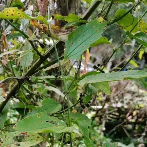 菝葜,菝葜科菝葜属 多年生藤本落叶攀附植物,茎干较粗,嫩白色,呈圆柱形,表面带有小刺;叶子较大,…