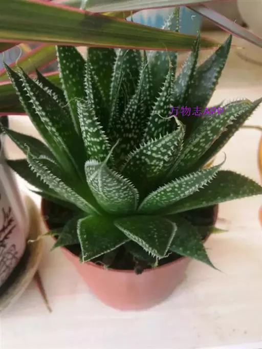 绫锦(学名Aloe aristata ),百合科芦荟属多年生肉质草本,株高可达12厘米,叶片呈莲座状,叶上有小白色斑点和白色软刺,叶缘具细锯齿,深绿色。