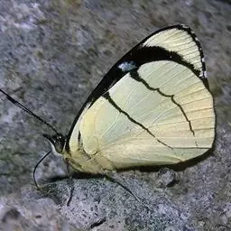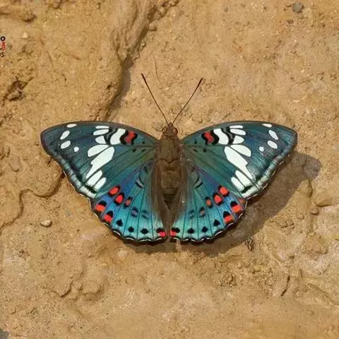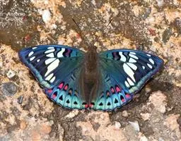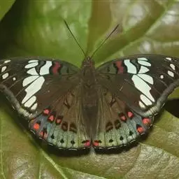 珀翠蛱蝶 两翅墨绿色,前翅中室内有深色横纹,中室外及近顶角处有数个白斑,后翅亚外缘有一列暗绿色箭形斑,外缘有白边,幼虫寄主未明。