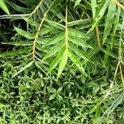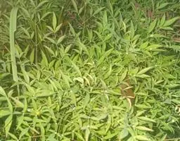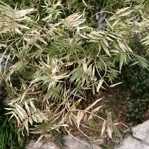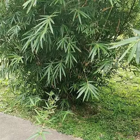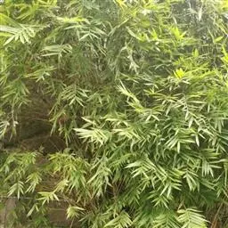凤尾竹 Raeusch. ex Schult. ’Fernleaf’ R. A. Young)是禾本科,簕竹属孝顺竹的变种。植株较高大,杆高可达6米,竿中空,小枝稍下弯,下部挺直,绿色;竿壁稍薄;节处稍隆起,无毛;叶鞘无毛,纵肋稍隆起,背部具脊;叶耳肾形,边缘具波曲状细长繸毛;叶舌圆拱形,叶片线形,上表面无毛,下表面粉绿而密被短柔毛,小穗含小花,中间小花为两性;外稃两侧稍不对称,长圆状披针形,先端急尖;内稃线形,脊上被短纤毛,花药紫色,子房卵球形,羽毛状。成熟颖果未见。原产中国,华东、华南、西南以至台湾、香港均有栽培。凤尾竹喜温暖、湿润和阳光充足的环境,耐寒。宜土层深厚、肥沃、疏松的微酸性壤土。该种观赏价值较高,宜作庭院丛栽,也可作盆景植物。全草或根入药,味淡、微苦,性寒,有清热利湿、凉血止血、消肿解毒功效,可治痢疾、泄泻等多种病症。凤尾