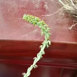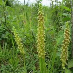 花葶直立,纤细,常紫色,略压扁,两侧具很狭的翅;总状花序长1-2厘米,通常具10-20朵花;花苞片宽卵形,长约0.5毫米,多少围抱花梗;花梗和子房长1-1.3毫米,明显长于花苞片;花很小,黄色;中萼片宽卵形至近长圆形,长1-1.2毫米,宽约0.7毫米,先端钝,边缘外卷;侧萼片三角状卵形,大小与中萼片相似。