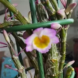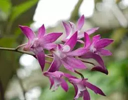 玫瑰石斛是兰科石斛属的多年生附生草本植物。茎斜下或下垂,青绿色,圆柱形,…