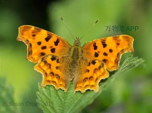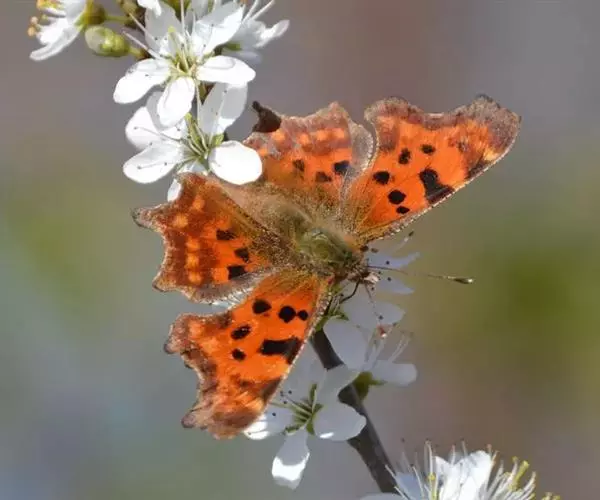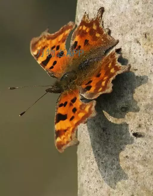 与白钩蛱蝶(P.c-album)相似又混合发生,主要区别是:前翅中室内有3个黑褐斑;后翅中室基部有1个黑点;前翅后角和后翅m2、cu1、cu2室外端的黑斑上有蓝色鳞片;翅外缘角突尖锐,秋型尤甚。