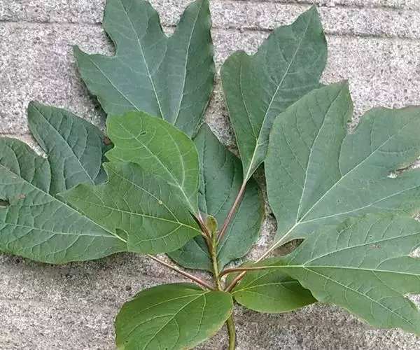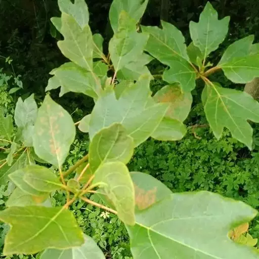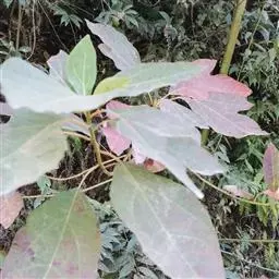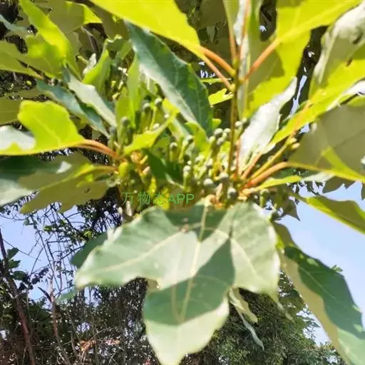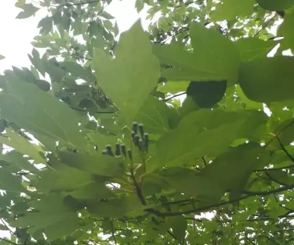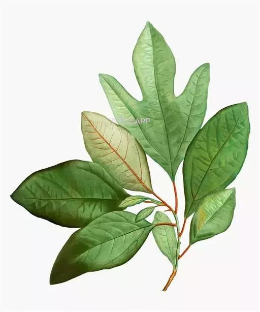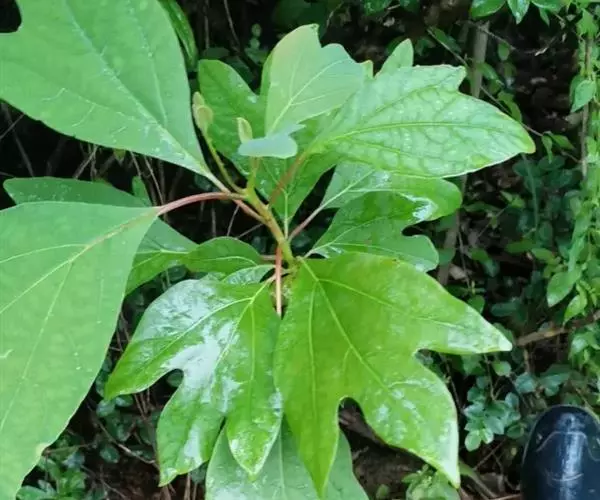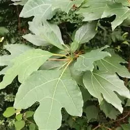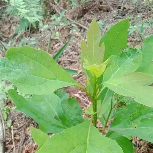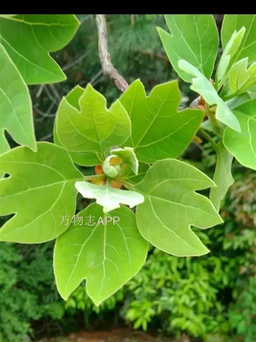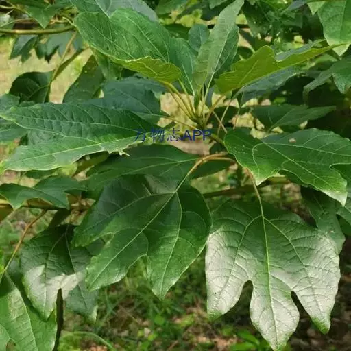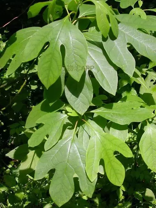落叶乔木,高可达35米,胸径达2.5米;树皮幼时黄绿色,平滑,老时变灰褐色,呈不规则纵裂。顶芽大,椭圆形,长达1.4厘米,直径0.9厘米,芽鳞近圆形,外面密被黄色绢毛。枝条粗壮,近圆柱形,多少具梭角,无毛,初时带红色,干后变黑色。叶互生,聚集于枝顶,卵形或倒卵形,长9-18厘米,宽6-10厘米,先端渐尖,基部楔形,全缘或浅裂,裂片先端略钝,坚纸质,上面绿色,晦暗或略光亮,下面灰绿色,两面无毛或下面尤其是沿脉网疏被短硬毛,羽状脉或离基三出脉,中脉、侧脉及支脉两面稍明显,最下方一对侧脉对生,十分发达,向叶缘一方生出多数支脉,支脉向叶缘弧状网结;叶柄纤细,长(1)2-7厘米,鲜时常带红色,腹平背凸,无毛或略被短硬毛。