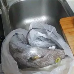 用料酒,精盐调匀,分别抹在鱼头和鱼肉上。