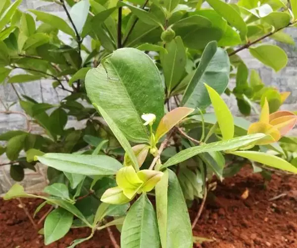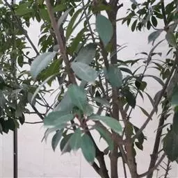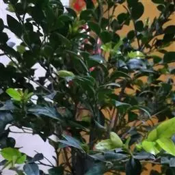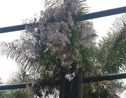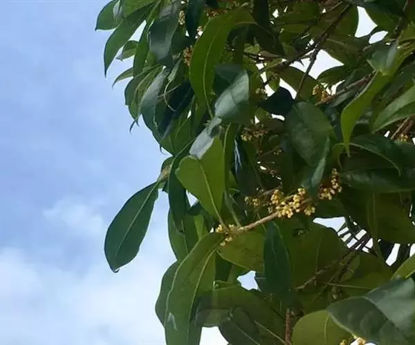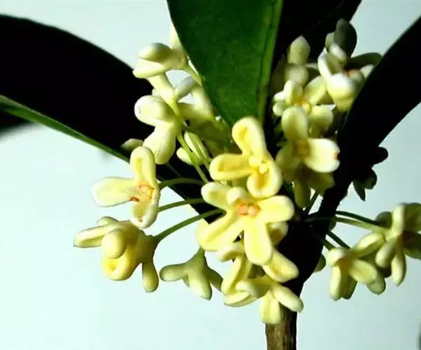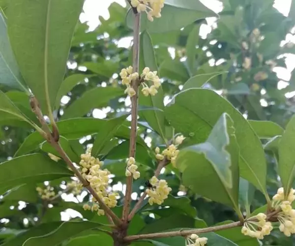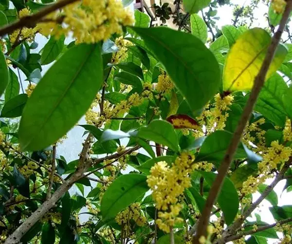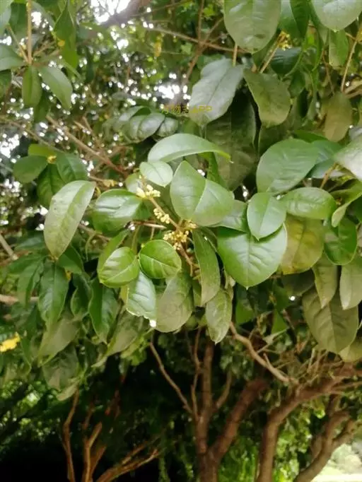 为常绿阔叶大乔木,高可达15米,树冠可覆盖400平方米,桂花实生苗有明显的主根,根系发达深长。幼根浅黄褐色,老根黄褐色。嫁接苗的根系因砧木而异;插条埋入土中各处易生不定根,但无明显主根。桂花分枝性强且分枝点低,特别在幼年尤为明显,因久常呈灌木状。密植或修剪后,则可成明显主干。树皮粗糙,灰袍色或灰白色,有时显出皮孔。叶面光滑,革质,近轴面暗亮绿色,远轴面色较淡;椭圆形,长椭圆形、卵形、倒卵形,披针形、倒披针形、长披针形至卵披针形。