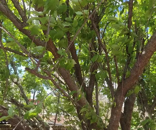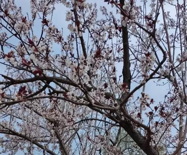 杏树是乔木,高5-8(12)米;树冠圆形、扁圆形或长圆形;树皮灰褐色,纵裂;多年生枝浅褐色,皮孔大而横生,一年生枝浅红褐色,有光泽,无毛,具多数小皮孔。