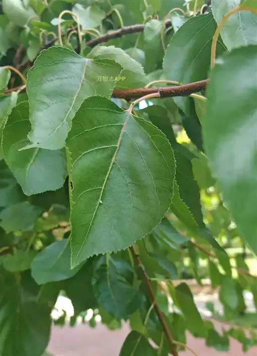 叶片宽卵形或圆卵形,长5-9厘米,宽4-8厘米,先端急尖至短渐尖,基部圆形至近心形,叶边有圆钝锯齿,两面无毛或下面脉腋间具柔毛;叶柄长2-3.5厘米,无毛,基部常具1-6腺体。