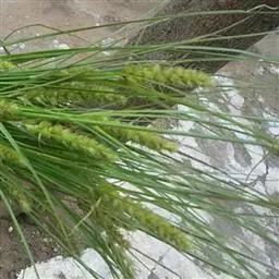 穗状花序柔软,绿色或稍带紫色,长约10厘米(包括芒);穗轴成熟时逐节断落,节间长约1毫米,棱边具短硬纤毛;三联小穗两侧者各具长约1毫米的柄,两颖为长5-6厘米弯软细芒状,其小花通常退化为芒状,稀为雄性;中间无柄小穗的颖长4.5-6.5厘米,细而弯;外稃披针形,具5脉,长5-6毫米,先端具长达7厘米的细芒;内稃与外稃等长。花、果期5-8月。
