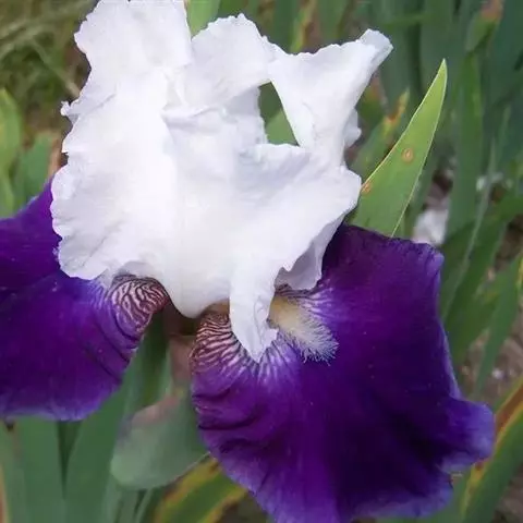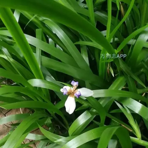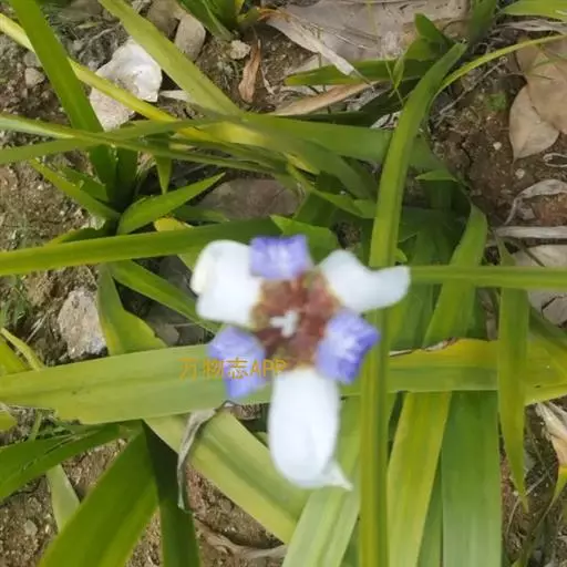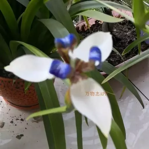巴西鸢尾株高约40~50公分,叶从基部根茎处抽出,呈扇形排列。叶宽约2公分,革质,深绿色;花期约春至夏 巴西鸢尾 季,花茎扁平似叶状,但中肋较明显突出,花从花茎顶端鞘状苞片内开出,花有6瓣,3瓣外翻的白色苞片,基部有红褐色斑块,另3瓣直立内卷,为蓝紫色并有白色线条。花通常上午开放,至下午3~4点就开始内卷枯萎了,但花鞘内的花开完後,会长出小苗,小苗越长越大最後降至土表,发根成苗,而小苗隔年就有开花能力。 巴西鸢尾的繁殖方式很奇特,像吊兰一样,在开花后会从花鞘内长出小苗。
