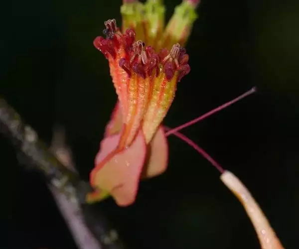 密簇聚伞花序,1-3个生于小枝已落叶腋部或腋生,具花3-5朵,总花梗长7-11毫米,花梗长约1毫米;苞片长卵形,淡红色,长12-22毫米,宽7-11毫米,顶端渐尖,基部圆钝或浅心形,具直出脉3-7条,干后纸质;花红色或橙色,花托卵球形,长约2毫米,被黄褐色或锈色绒毛;副萼杯状,长约1毫米,具5浅齿;花冠长2-2.8厘米,具疏生星状毛,冠管上半部膨胀,具5纵棱,纵棱之间具横皱纹,裂片狭长圆形,长6-8毫米,反折;花丝长2-2.5毫米,花药长1.5-2毫米。