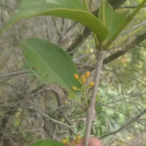 叶薄革质,互生或近对生,或3-4枚簇生于短枝上,长圆形或长卵形,长2.5-7厘米,宽1-3厘米,顶端急尖或钝,基部楔形或圆钝;叶柄长2-7毫米。