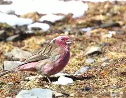 喜马拉雅白眉朱雀:小型鸟类,体长15-17厘米,体重24-35克。额基、眼先深红色,…